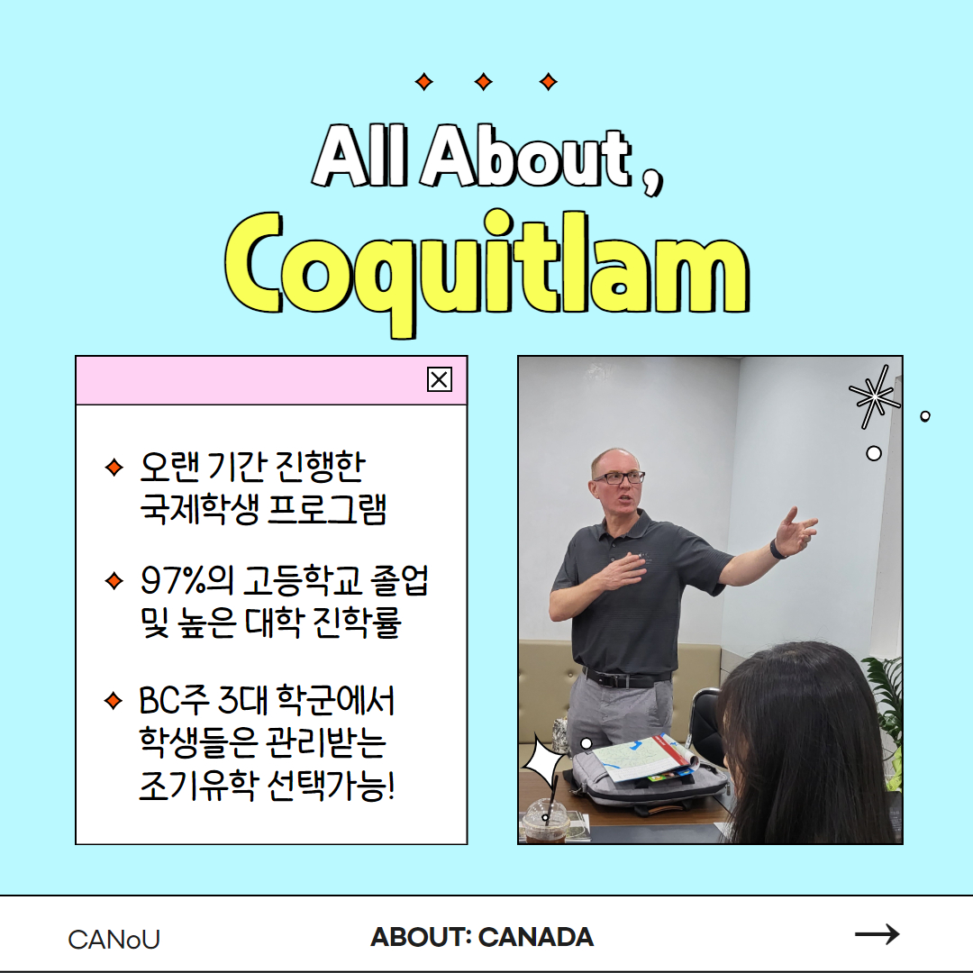 안녕하세요! 당신의 가능성을 여는 유학 캐노유 CANoU 입니다 :) 저희 캐노유는 25년 새해 첫 유학세미나를 준비하면서 많은 학생들이 현지 담당자님들과 직접 소통할 수 있는 세미나를 준비하고 있습니다. 현지 유학생활, 지역분위기에 대해서 직접 소통하고 이야기를 나눌 수 있는 기회가 될 것인데요! ** 1월 세미나 일정 공개! ** 1월 10일 BC주 버나비 교육청 1월 17일 BC주 아보츠포드 & 코퀴틀람 교육청 1월 18일 밴쿠버 보드웰 하이스쿨 여름방학캠프 (온라인) 1월 25일 UIS 사립학교 오늘은 1월 10일 그리고 1월 17일 진행되는 BC주 공립교육청 세미나 일정을 안내드립니다! [BC주 버나비 (Burnaby) 교육청 오프라인 세미나] 날짜 : 1월 10일 금요일 오후 5시 장소 : 캐노유 종로본사 / 서울 종로구 삼봉로 81 두산위브파빌리온 6층 615호 버나비 지역은 교통이 편리하며 아름다운 자연환경과 더불어 편의시설의 접근성이 좋은 지역입니다. 버나비 교육청은 학업 성취도가 높은 지역으로 캐나다에서 가장 많은 AP 과목을 선택할 수 있는 교육청이죠 특히 부모님이 함께 동반하는 조기유학에서 부모님이 살기 편하고 아이들은 공부하기 좋은 지역으로 손꼽힙니다 :) [BC주 아보츠포드 (Abbotsford) 교육청 오프라인 세미나] 날짜 : 1월 17일 금요일 오후 5시 장소 : 캐노유 종로본사 / 서울 종로구 삼봉로 81 두산위브파빌리온 6층 615호 아보츠포드 지역은 밴쿠버 다운타운에서 비교적 거리가 있는 지역으로 비교적 국제학생 및 이민자의 비율이 낮은 지역입니다. 전반적으로 인프라와 영어집중도의 밸런스가 좋은 지역으로 생각하며 무엇보다 국제학생에 대한 케어를 위한 전담 팀을 운영하고 한국인 교육감님이 국제학생 총괄 디렉터로 계신다는 것도 장점이 될 수 있죠! [BC주 코퀴틀람 (Coquitlam) 교육청 오프라인 세미나] 날짜 : 1월 17일 금요일 오후 5시 장소 : 캐노유 종로본사 / 서울 종로구 삼봉로 81 두산위브파빌리온 6층 615호 코퀴틀람은 이미 많은 분들이 알고 계신 지역으로 이미 좋은 학군으로 유명하죠. 학생들은 충분한 인프라에서 AP나 IB 프로그램을 선택할 수도 있고 다양한 방과 후 활동, 국제학생을 위한 스페셜 액티비티를 선택할 수 있습니다. 이번 캐노유 유학세미나를 위해 직접 한국을 찾아와주시는 Jeff 디렉터님의 열정적인 스피치를 듣고 싶다면 이번 세미나에 참석을 신청해주세요 :) 캐노유를 통한 캐나다조기유학은 학생들에게 가장 적합한 조기유학의 지역선택부터 입학지원 수속절차, 슬기로운 유학생활을 위한 선행학습, 조기유학에서 이어지는 해외대학입시까지 One-Stop으로 이루어집니다! 여러분도 캐노유, 그리고 이번 유학세미나를 선택해서 후회없는 캐나다 조기유학을 알아보세요 :) |
