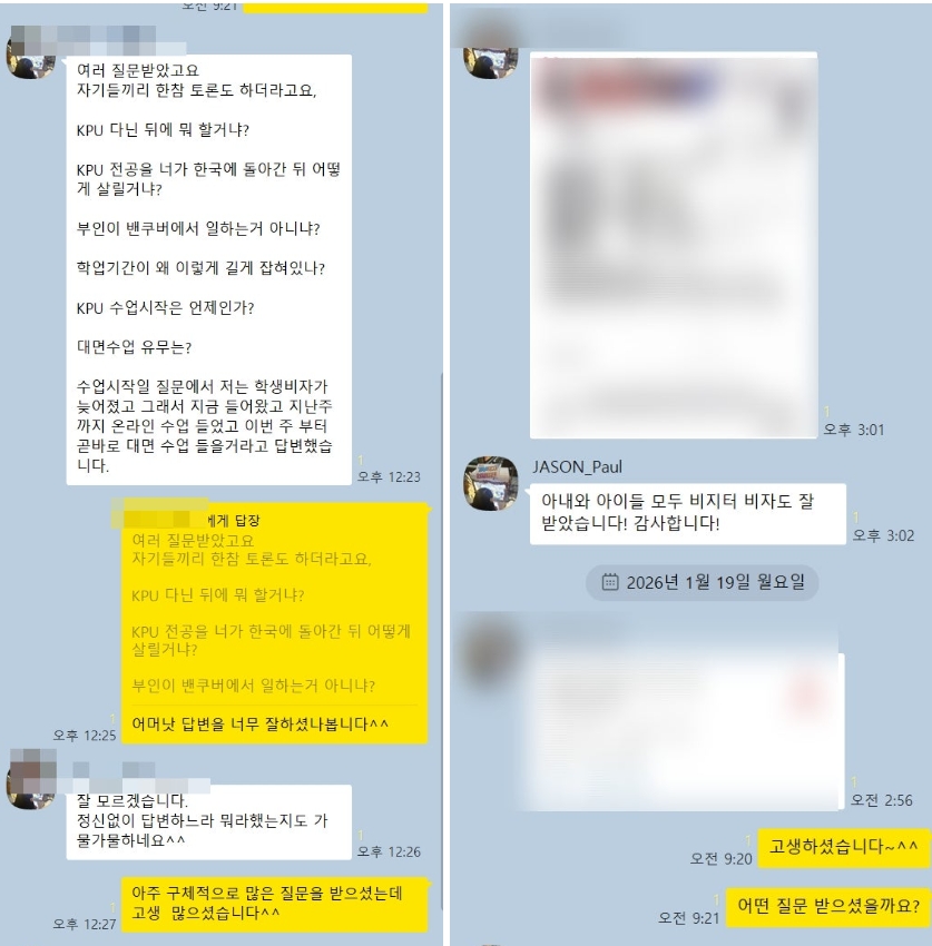 안녕하세요. 당신의 가능성을 여는 유학 캐노유 유학원입니다. 토요일에 캐나다 벤쿠버로 출국한 자녀무상 가족분들의 이민국오피스에서의 인터뷰 후기 공유합니다. 저희 벤쿠버에 위치한 콴틀란대학교 입학허가를 받으신 아버님이십니다!! 신체검사 재검이 나오셔서 다른분들보다는 비자가 조금 늦게 나오셨어요ㅠㅠ 하지만 무사히 가족분들 모두 비지터레코드 비자를 잘 받았으셨습니다. 최근 가족 전체가 나가시는 사례가 많아지고 있는데요 이분들 또한 배우자. 자녀2명까지해서 총 4명의 가족분들이 캐나다벤쿠버로 입국하셨으며 인터뷰를 잘받으신 케이스입니다. 축하드립니다!! 여러 질문받았고요 자기들끼리 한참 토론도 하더라고요, KPU 다닌 뒤에 뭐 할거냐? KPU 전공을 너가 한국에 돌아간 뒤 어떻게 살릴거냐? 부인이 밴쿠버에서 일하는거 아니냐? 학업기간이 왜 이렇게 길게 잡혀있나? KPU 수업시작은 언제인가? 대면수업 유무는? 수업시작일 질문에서 저는 학생비자가 늦어졌고 그래서 지금 들어왔고 지난주까지 온라인 수업 들었고 이번 주 부터 곧바로 대면 수업 들을거라고 답변했습니다. 안녕하세요! 추석연휴도 있어서 가족 다같이 신체검사를 받으려면 늦어질것 같아서요, 저만 다음주 초에 신검을 받으려고 합니다! 비자에 맞춰서 비행기 예매하려고요. 질문1> 가족이 각각 다른 병원에서 신체검사 받아도 상관없겠지요? 질문2> 요즘 비자가 빨리나오나요? 지난 여름엔 늦게 나왔다는 말이 있어서요. 답변: 답변1) 다른병원에서 신체검사받아도 상관없습니다. 답변2) 최근 2달정도는 걸리는듯합니다. 비행기 예매는 몇일날짜 출국으로 생각하시나요? 랜딩서비스 담당자와 미팅후 출국날짜잡으시는게 좋을듯합니다 ----------------------------------------------------------------------------- 질문 내년 1월 초 수업 시작으로 알고 있는데, 한국서 15일에 출국하면 너무 늦는건가요? 화상아닌 대면수업으로 신청하려고 하는데, 수강 마지노선이 언제까지인가요? 답변: 안녕하세요. 수강신청은 한국에하고가시는거세요~^^ 시작하기 한달~2달전에 수강신청 이멜이 오실겁니다. 질문 안녕하세요! 디파짓 5000불이고 인터내셔널 학생은 1년치 학비를 납부한다는 내용도 확인했습니다! 지금 제 중학생 아들을 어렵게 설득해서 겨우겨우 내년 1월에 가서 6개월간 있기로 얘기가 됐습니다. 물론 아이가 추후에 더 있겠다고 하면 1년 이상도 있을 생각인데, 현재로서는 6개월까지 있다가 들어오자라고 얘기가 됐습니다. 질문> 이런 상황에서 디파짓 5000불만 내고 콴틀란 수업을 들을시 아이들 한학기 (6개월) 무상교육이 가능할까요? 답변: 최근 1년치 학비를 안내면 자녀 학교등록이되지않습니다. 공식적인 방법으로 1년 학비 납부를 추천드립니다. .