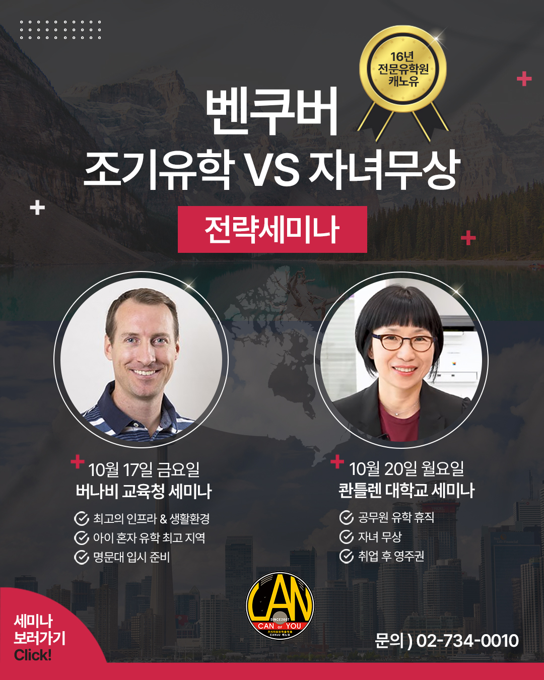 ????엄마들 입소문 사이에서만 들을 수 있는 인기있는 캐나다 지역은??? ???? 벤쿠버 전략세미나 조기유학 VS 자녀무상 ???? 만족도 100% 캐나다 버나비 지역 학업,안전, 날씨, 인프라 모두 완벽한 지역 ???? 공무원유학휴직& 자녀무상최고 지역 써리& 랭리 콴틀란대학교 ** 10월 세미나 일정 공개! ** [BC주 버나비 (Burnaby) 교육청 오프라인 세미나] 날짜 : 25년 10월 17일 금요일 오후 5시 * 최고의 인프라 & 생활환경 * 아이혼자 유학& 부모동반 최고지역 * 명문대 입시준비전략 관련 정보제공 * 캐노유 조기유학전 튜터링& 가디언서비스& 정착서비스 [BC 주 콴틀란대학교 자녀무상 오프라인 세미나] 날짜 : 25년 10월 20일 월요일 2시 * 공무원유학 휴직 최고지역 * 자녀무상 지역 (써리 & 랭리) * 취업후 영주권 전공소개 http:// * 세미나 혜택* 지원비 면제 혜택. 수속비 최대할인, 캐노유 유학전 영어.수학, 과학 튜터링 . 해외대학입시컨설팅 상담 ????세미나 참여신청 : 프로필링크 구글폼 작성! ☎️전화상담 & 문의 : 02-734-0010☎️
