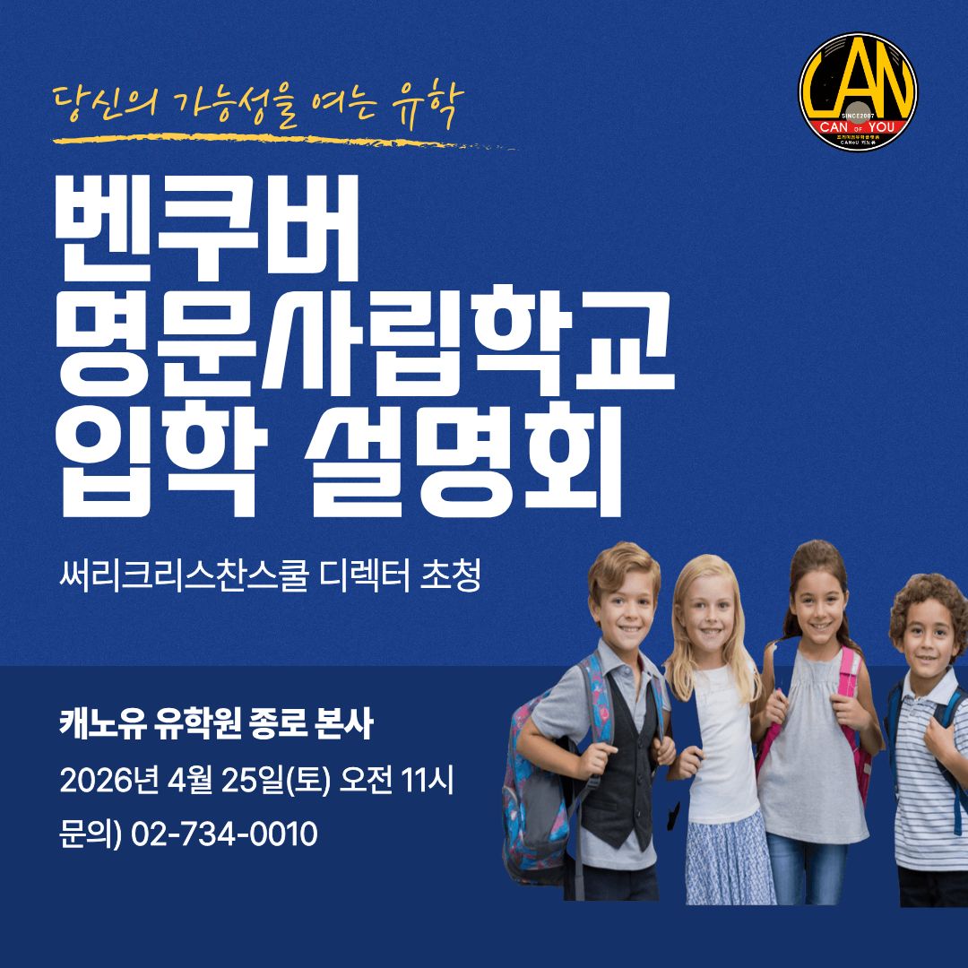???? 밴쿠버명문 사립학교 써리크리스찬스쿨 입학설명회 _26년 4월 25일(토)