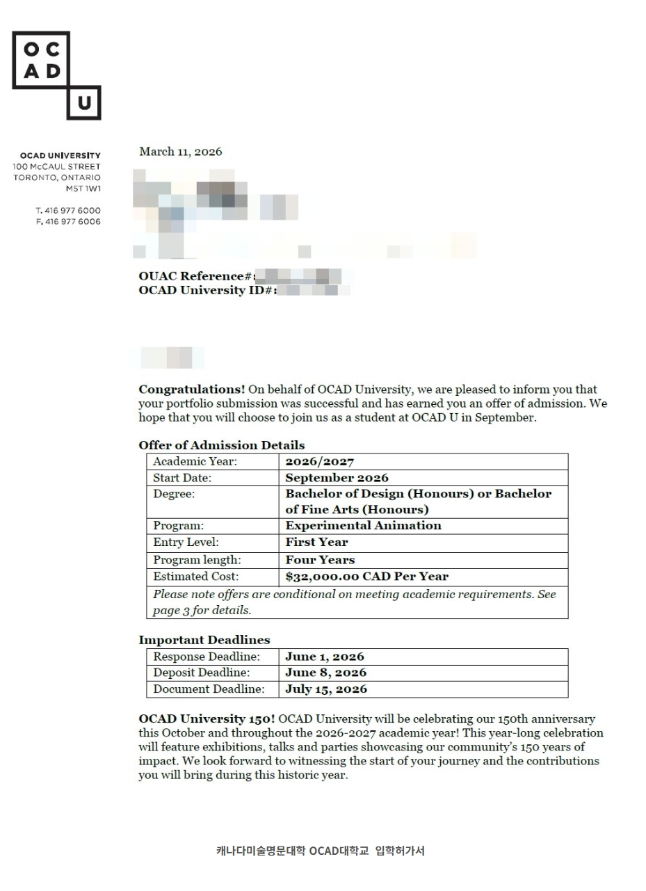 안녕하세요 . 당신의 가능성을 여는 유학 캐노유 유학원입니다. 오늘은 좋은 소식들을 전해드리려고합니다. 캐나다조기유학으로 G11 부터 유학을 진행했던 학생이며 OCAD 대학교와 쉐리던대학교 둘다 오퍼 소식이 나와서 전해드립니다. OCAD 는 3개전공다 오퍼가 나왔어요!! 학생의 지원학교및 전공 리스트 OCAD University - Illustration OCAD University - Experimental Animation OCAD University - Drawing & Paining Sheridan Honours Bachelor of Illustration Sheridan Honours Bachelor of Animation Sheridan Honours Bachelor of Experiential Design |