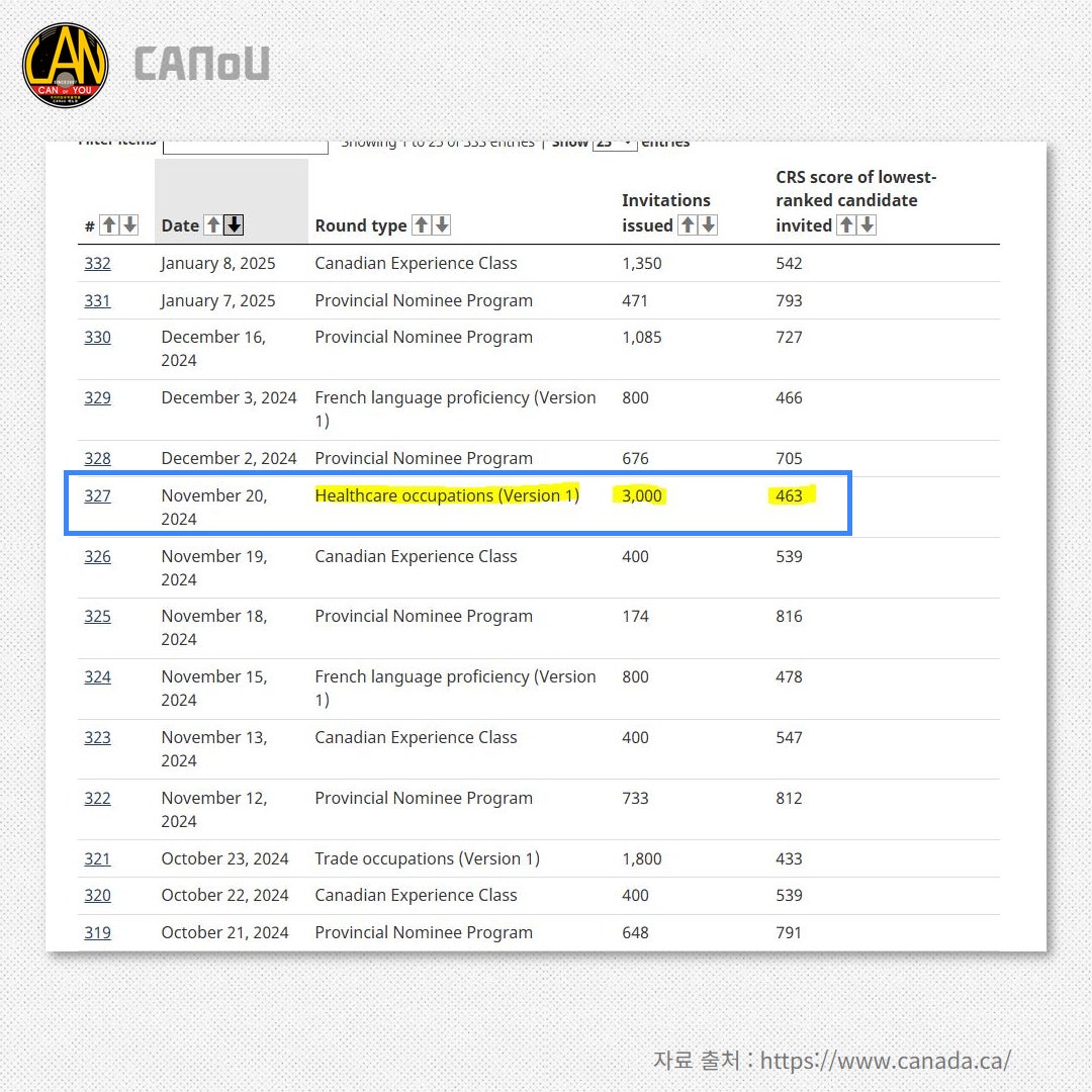 2) 이민 점수제 선발 영역 중 (EE / PNP)에서 의료보건 카테고리 선발이 더욱 많은 인원에 대해 비교적 낮은 CRS 점수로 인비 받는 중입니다.