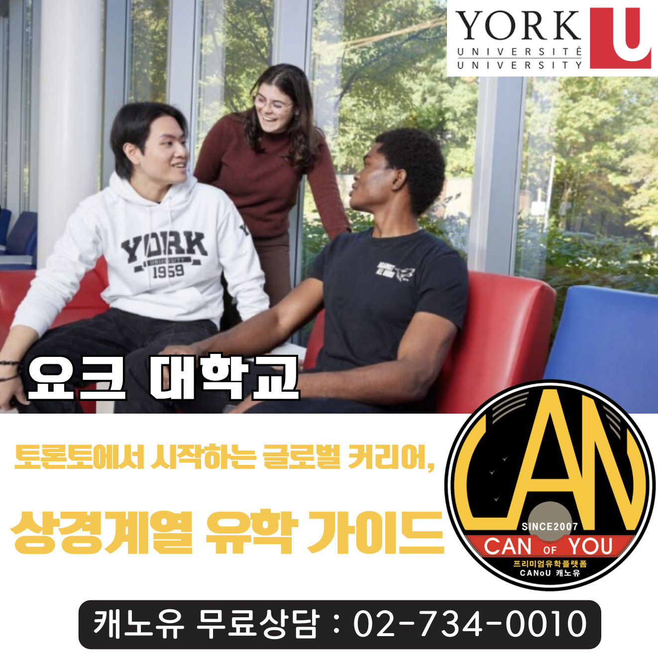 안녕하세요. 당신의 가능성을 여는 유학, 캐노유입니다. 토론토에서 비즈니스 전공, 상경계열 유학, 취업 연결형 대학을 찾고 있다면 반드시 확인해봐야 할 학교가 바로 요크대학교(York University) 입니다. 특히 요크대학교 커머스(Commerce, BCom) 과정은 토론토라는 뛰어난 입지, 실무형 커리큘럼, 다양한 진로 확장성까지 갖추고 있어 국제학생들에게 꾸준히 관심을 받고 있는 전공입니다. 1. 요크대학교는 어떤 학교일까? 요크대학교(York University) 는 캐나다 온타리오주 토론토에 위치한 대형 공립 연구중심대학교입니다. 현재 Keele, Glendon, Markham의 3개 캠퍼스를 운영하고 있으며, 공식 소개 기준으로 학생 수는 53,100명 이상 규모입니다. 또한 요크대학교는 최근 QS World University Rankings 2026에서 세계 333위, Maclean’s 2025 종합대학(Comprehensive) 부문 Top 5, THE Impact Rankings 2025 세계 Top 40 수준으로 평가되고 있습니다. 즉, 요크대학교는 단순히 규모만 큰 학교가 아니라 인지도, 연구력, 사회적 영향력, 실무 연결성까지 고르게 갖춘 토론토의 대표 대학이라고 볼 수 있습니다. 2. 요크대학교 캠퍼스 특징 요크대학교는 3개 캠퍼스를 운영합니다. Keele Campus 메인 캠퍼스로 대부분의 학부 프로그램과 주요 시설이 모여 있습니다. 토론토 지하철과 연결되어 있어 접근성이 매우 좋고, 대형 종합대학다운 캠퍼스 인프라를 갖추고 있습니다. Glendon Campus 토론토 내에서도 보다 소규모·리버럴아츠 중심의 환경을 가진 캠퍼스입니다. 영어·프랑스어 이중언어 기반 교육으로 알려져 있습니다. Markham Campus 2024년 개교한 신설 캠퍼스로, 기술·혁신·기업가정신·산학협력 중심의 방향성이 강한 것이 특징입니다. 3. 요크대학교가 비즈니스로 유명한 이유 요크대학교가 비즈니스 분야에서 자주 언급되는 가장 큰 이유는 바로 Schulich School of Business 의 높은 인지도 때문입니다. 슐릭은 학교 공식 기준으로 2025 LinkedIn 세계 MBA Top 100, 2026 QS Global MBA Top 100, 2025 Corporate Knights MBA 세계 3위, 캐나다 1위 등 다양한 평가를 받고 있습니다. 다만 여기서 중요한 점은, 많은 분들이 헷갈려 하시는 것처럼 요크대학교 Commerce(BCom) 와 Schulich 학부 BBA/iBBA 는 같은 요크대학교 소속이지만 서로 다른 학부 과정이라는 점입니다. 카페 글에서는 이 부분을 정확히 구분해주는 것이 신뢰도에 도움이 됩니다. 요크대 커머스는 Faculty of Liberal Arts & Professional Studies 산하 School of Administrative Studies 에서 운영됩니다. 4. 요크대학교 커머스(Commerce)란? 요크대학교 커머스 는 실무와 취업 연결성을 중시하는 대표적인 캐나다 상경계열 학부 과정입니다. 이 프로그램은 회계, 재무, 마케팅, 인사, 운영, 공급망 등 비즈니스 전반을 폭넓게 다루며, 학생이 진로를 조금 더 탐색한 뒤 방향을 구체화하기에 좋은 구조를 갖고 있습니다. 특히 요크대학교 커머스는 토론토라는 대도시 안에서 기업 네트워킹, 인턴십, 현장경험 기회를 노릴 수 있다는 점에서 국제학생들에게 현실적인 선택지로 많이 검토됩니다. 이 평가는 학교의 토론토 입지와 다양한 커리어 지원 인프라를 바탕으로 한 해석입니다. 5. 요크대학교 커머스 전공 선택 폭 요크대학교 커머스는 다양한 비즈니스 세부 분야로 이어질 수 있습니다. 대표적으로 다음과 같은 분야를 고려할 수 있습니다. Accounting Finance Marketing Human Resources Management Supply Chain Management Business Research ITEC(Information Technology 관련 분야) 즉, 처음부터 진로가 완전히 정해지지 않은 학생도 입학 후 학업을 하면서 자신에게 맞는 방향을 구체화하기 좋습니다. 6. 토론토에 있는 대학이라는 점이 왜 중요할까? 토론토 비즈니스 유학을 고민할 때 입지는 정말 중요합니다. 요크대학교는 캐나다 최대 경제권인 토론토에 위치해 있어 금융, 회계, 마케팅, 스타트업, 테크, 컨설팅 등 다양한 산업과의 거리감이 상대적으로 적습니다. 또 학교 역시 experiential learning과 career-ready 경험을 강조하고 있습니다. 그래서 요크대학교 커머스는 “학교 이름”만 보는 선택이 아니라, 토론토에서 공부하면서 진로 경험까지 함께 쌓고 싶은 학생에게 잘 맞는 전공이라고 볼 수 있습니다. 7. 요크대학교 입학 조건과 영어 조건 요크대학교 학부 지원 시에는 공인 영어성적 제출이 필요한 경우가 많습니다. 학교 공식 영어 요건 페이지 기준으로, 요크대학교는 IELTS Academic, TOEFL iBT 등 공인시험을 인정하고 있으며 세부 최소 기준은 지원 단위에 따라 다를 수 있으므로 반드시 공식 페이지에서 확인해야 합니다. 카페 글에서는 보통 아래처럼 안내하시면 자연스럽습니다. 요크대학교 지원 시 공인 영어성적이 필요하며, 세부 기준은 전공과 전형에 따라 달라질 수 있으므로 지원 전 최신 공식 요건을 확인하는 것이 중요합니다. 또한 국제학생의 학업 성적, 필수 과목 이수 여부, 영어요건 충족 여부에 따라 다이렉트 입학 / 조건부 입학 / 패스웨이 / 편입 루트 등을 함께 검토할 수 있습니다. 이 부분은 학교별·전형별 차이가 있으므로 개별 상담이 중요합니다. 8. 요크대학교 학비는 어느 정도일까? 요크대학교 국제학생 학비는 전공, 학점 수, 등록 과목에 따라 달라질 수 있어 정확한 비용은 매년 학교 공식 